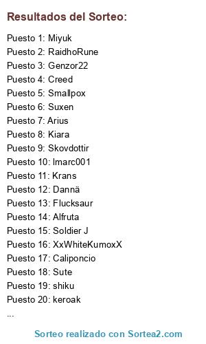 Lista de participantes: shiku(2 participaciones), Lomram Letsap(2 participaciones), Dannä(4 participaciones), Soldier J(2 participaciones), Flucksaur(4 participaciones), lmarc001(2 participaciones), Creed(4 participaciones), Skovdottir(4 participaciones), Titan09(4 participaciones), phicode(2 participaciones), Miyuk(4 participaciones), RaidhoRune(4 participaciones), Duarah(4 participaciones), vier fuentenegra, Sharker, Blath(2 participaciones), Smallpox(4 participaciones), Tilien, XxWhiteKumoxX(4 participaciones), Bors, Caliponcio(4 participaciones), Suxen(2 participaciones), Druk, El tio de goma(2 participaciones), Arius(2 participaciones), Krans(4 participaciones), Lyuren(4 participaciones), Kybathz, TheLaurus.1640, Genzor22(4 participaciones), Ascaloniano(2 participaciones), painy08(2 participaciones), keroak(4 participaciones), Sute, bamsu, Scarmak(2 participaciones), Rafnarac, Kiara(2 participaciones), Alfruta(2 participaciones).