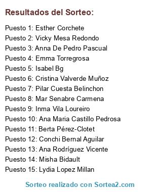 Lista de participantes: Fatima VO, Vane Feliponea, Sandra Rubio Gutierrez, Laura Vaquero Román, Carmen Muñoz, Macoy Mo, Pepi Romero Alvarez, Toñi Agullo Moll, Isabel Román Martinez, Angel Aranda, Gema Urra Castaño, Patricia Fernández Santos, Cintia Cedro Lopes, Maria Benito, Jesús Márquez, Josefita Ato, Nuria Perez Ortega, Angela Molina, Nerea Mazuela, Nuria Macías G, Raul Perez, María Bamio, Inés Diaz, Alicia Caro, Cruz Matabu, Robert Resorte, Silvia Ariza, Susana Nuño, Jesus Angel Vigeriego Minguez, Miriam Cruz, Daniela Daniela, Marta Sanchez Lopez, Julia Luna, Naira Regúlez, Patty Lilo, Georgina Vega, Sandra Blancart Aguilera, J Carlos Rubio Prestel, Tania Fuentes Benítez, Romina Schott, Begoña Lagardera, Charo Gil, Rosa Rodriguez, Mari A. GV, Ines Rocha, Gabriela Cristina Costache, Lourdes C. Coello, Paloma Mora Rosado, Susana Perez, Sonia Rabadán, Jose Javier Nieto, Yolanda Hernán, Isa Gomez Alonso, Mari Carmen López Munuera, Mar Lopez Velasco, Isabel García, Natalia Pérez Pérez, Maria Callejon, María Martínez Esteban, Sari Álvarez, Ángeles Villanova Barrachina, Maria Jose Simon Molina, Sandra Zornoza Garcia, Paqui Rubio Coronado, Mary Maria, Ángela Salgueiro, Carmen Bernal Alvarez, Ana Maria Lucaci, Xenia Perez, Rosazul Florista Adriana, Eva Fortuño, Marina Martín, Lara García-Granero, Marisol Moreno Moreno, Nuria Fernández Muñoz, Natalia Mas, Rosana Fernández Quiza, Julia Figueras, Rebeka Pla, Mariano Sáez Montes, Gloria Rodriguez Puertas, Natalia Vergara Ibáñez, Marta Diaz, Marisa Moya, Estibalitz Marzana, Patricia Calvo Montes, Ana Galvez, Raixa Raixa Cabrera Rodriguez, Luz Belen Franco Gamero, Pilar Gallego Crespo, Maite Pita Alonso, Isabel Bg, Maria Soar, Mayra Sobrero, Mariluz Gutiérrez Gordo, María Del Valle Rozalen, Roxana Neagu, Esther Marcos Herrero, Begoña C. Ortega, Gemma Fierro, Ana Parra Alonso, Maria Gomez, Belen Cuenca-Romero, Ana Belén Moreno, María Redondo López, Olga Palahi, Elena Fg, Ana Maria Izquierdo, Cris Salas, Ana Rodriguez, Agustina Santervás, Itziar Arrausi, Virginia Portilla Silva, Sara Crespo Campos, Ana Igual Lazcano, Monika Pavlova, Lydia Sanchez Santos, Anna De Pedro Pascual, Montse Jimenez Gonzalez, Angelines Sanchez Aguado, Betty Llensa Bou, Mónica Estadella García, Empar Fora Cognoms, María Navas, Fanie Di Natale, Generador Contenidos, Emma Torregrosa, Jaione Robles Iriondo, Maria Eugenia Giron Les, Jess Mab, Seyla Domingo Ortiz, Eguskiñe Fernandez, Beatriz Esteban, Beatriz Ruiz Torrente, Verónica Pérez, Bego Alvarez, Lola Mulero, Victoriana Barrera Barba, Conchi Fernández Valledor, Pipe Perez, Maria V Garcia, Ainhoa Lazarraga, Jennifer Sierra, Silvana Gopes, Vanesa Hiraldo Briones, Marta Fernandez, Adriana Uribe, Isabel Cornejo, Sonia Lopez Fandiño, Yazmina Rz, MOntse Sagrera, Isaac Perez Velazquez, Nuria Azcona, Zulema Pontes Vidal, Vicky Mesa Redondo, Victoria Veintimilla Santos, Marta Moore, Agustina Hernandez Garcia, Mar Bascon, Iuliana Andreea Munteanu, Silvia Bartolome, Sonia Perez Martinez, Marcela Ulehla Mrazova, Maria Conchi, Silvia Curto Rodriguez, Antonia Moyano, Virginia Vielva, Maria Jose Marin Hervas, Carmen García Moreno, MaBel Palomero, Sandra Clemente Orte, Rebeca Marquez Cruces, Cristina Laguna Bellon, Loreto CR, Yolanda Álvarez, Sonia Moreno Lopez, Maria Sanz Sanz, Lily Calma, Teresa Martín Gavilán, Maria Jesus Moreno Torreblanca, Elena Begoña, Ana María García Rodríguez, Veronica Gómez Bonachera, Paqui Molina, María González Lucas, Conchi Bernal Aguilar, Ain Ara, Yolanda Pelaz Díez, Mon Mislilith, Marta Camp, Ale Hop, Mai Arrizabalaga, Viviana Andrea Muñoz Falero, Verónica Arenas Carreño, Mónica Fernández Sarabia, Teresa Vilarrubi Otero, Rafi Montavez Jiménez, Cristina Perujo Melgar, María José Martín, Inma Domingo, Celia Roza Rodríguez, Rakel Prado Rodríguez, Leticia Garcia Collantes, Lery LC, Sandra Marin Garcia, Ariadna Thomas, Susana Bandrés, Almu Garrido, Noelia Garcia Sanchez, María De Los Ángeles Allende, Maria Rosa Borbalan, Cristina Camacho García, Nela Roni, Angel Manlo, Mari Carmen Cerezo, Criss Jesús, Soraya Olivera López, Jose Vicente Serrano, Pilar Cuesta Belinchon, Monica Sierra, Maria Macia, Mariana Padilla Calero, Susana González Pastrana, Lorena Garcia Hernandez, Laura Gocentaite, Elena Iv, Nnoemi Ppujol, Manoli Montarroso, Isabel María Martínez, Encarni Rodriguez Pascual, Ana Brito, Dolors Senserrich Pairó, Guillerm Antonio, IngridyJose Peregrina Zafra, Virginia Monreal Martínez, Raquel Baña Mouzo, Alejandra García Barreiro, Mar Senabre Carmena, Ana Aranda, Elisabeth Hernandez, Marisol Pardellas Barros, Silvia De la Tierra, Debora Yubero Delgado, Ana María Pozo Fernández, Magdalena Sanchez, Santi Gutierrez, Fabiola Segura, Montse Cortiñas Perez, Jaime Molina, Silvia López Lería, Beatriz Camarena Ruiz, Luisa Maria Garcia Repiso, Maribel Moñino Parralejo, Vanesa Cobos Montiel, Maria Garcia-Mochales, Myriam Graciela García Cazorla, Adoracion Perez Nieto, Veronica Salan, Angeles Sanchez Gadea, Juan Manuel Rodriguez DE Granada, Marta Alonso Garcia, Dana Dascalu, Bea Blanco Bascuas, Charo Pisal, Marimar Téllez, Esther Frutos Muñoz, Veronica Llune Garcia, Carolina Rodriguez, María Teresa Ferreira, Clara Perez, Ana Rivera, Muñoz Alcala Ani, Laau Reeta, María Rdguez, Ana Begoña Rubio Galindez, Mónica Peña, Beatriz Guijarro, Loli Osuna Martinez, Inma Vila Loureiro, Lola Ramos Navas, Paula Mud, Maria RG, Laura Guzmán, Maria Jose Rosello, Moni Perez, Cristina Piñeiro, Vanesaa Rubio, Esther Gor, Esme Pintor, Isabel Sierra Alcañiz, Christine K. Wibrow-Tait, Andres Perez, Candelaria Curbelo Pérez, Lorena A Secas, Ana Eche, Farmacia Eduardo García Torres, Begoña Pardo Martinez, Maria Jose Canals, Laura Nogueiro Alvarez, María Díaz, El Gato Molón, Cristina Valverde Muñoz, Ana López, Maria Josep Queralt Queralt, Raquel Fuentes, Carmen Carcaño, Maria Gonzalez Martin, Sagrario Rodriguez, Vanessa SH, Mikel Bilbao, Ma