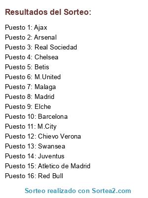 Lista de participantes: M.City, Malaga, Barcelona, Swansea, Elche, Madrid, Chelsea, Arsenal, Atletico de Madrid, Red Bull, Real Sociedad, Ajax, Betis, Juventus, M.United, Chievo Verona.