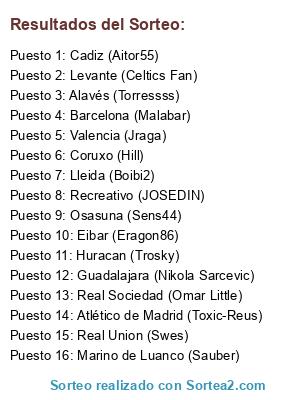 Lista de participantes: Cadiz (Aitor55), Lleida (Boibi2), Huracan (Trosky), Osasuna (Sens44), Real Union (Swes), Guadalajara (Nikola Sarcevic), Real Sociedad (Omar Little), Alavés (Torressss), Marino de Luanco (Sauber), Levante (Celtics Fan), Atlético de Madrid (Toxic-Reus), Coruxo (Hill), Eibar (Eragon86), Valencia (Jraga), Recreativo (JOSEDIN), Barcelona (Malabar).