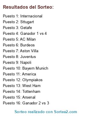 Lista de participantes: AC Milan, Juventus, Arsenal, Ganador 1 vs 4, Ganador 2 vs 3, Bayern Munich, America, Burdeos, Internacional, Aston Villa, West Ham, Getafe, Napoli, Olympiakos, Tottenham, Sttugart.