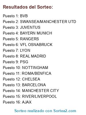 Lista de participantes: JUVENTUS, LYON, PSG, MANCHESTER CITY, BVB, BAYERN MUNICH, BARCELONA, AJAX, REAL MADRID, NOTTINGHAM, VFL OSNABRUCK, RANGERS, CHELSEA, RIVER/LIVERPOOL, SWANSEA/MANCHESTER UTD, ROMA/BENFICA.