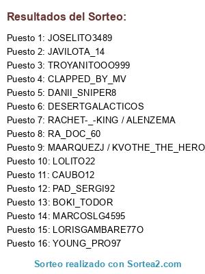 Lista de participantes: JAVILOTA_14, CAUBO12, BOKI_TODOR, LORISGAMBARE77O, MARCOSLG4595, LOLITO22, CLAPPED_BY_MV, JOSELITO3489, TROYANITOOO999, PAD_SERGI92, RACHET-_-KING / ALENZEMA, MAARQUEZJ / KVOTHE_THE_HERO, DANII_SNIPER8, DESERTGALACTICOS, RA_DOC_60, YOUNG_PRO97.