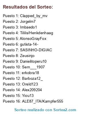 Lista de participantes: AlonsoGrayFox, Oreld123, Danielitoperu10, Imbaedo1, Jorgelm7, SASINHO-DIGIAC, erkobra18, Zeusinjo, Yiou13, Clapped_by_mv, Barboza12_, Sem___1907, Alex209204, gutista-14-, Tililis/Henkdenhaag, ALE87_ITA/Kampfer555.