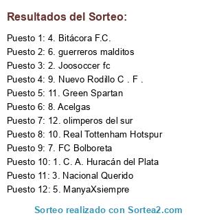 Lista de participantes: 1. C. A. Huracán del Plata, 2. Joosoccer fc, 3. Nacional Querido, 4. Bitácora F.C., 5. ManyaXsiempre, 6. guerreros malditos, 7. FC Bolboreta, 8. Acelgas, 9. Nuevo Rodillo C . F ., 10. Real Tottenham Hotspur, 11. Green Spartan, 12. olimperos del sur.