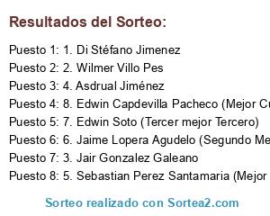 Lista de participantes: 1. Di Stéfano Jimenez, 2. Wilmer Villo Pes, 3. Jair Gonzalez Galeano, 4. Asdrual Jiménez, 5. Sebastian Perez Santamaria (Mejor tercero), 6. Jaime Lopera Agudelo (Segundo Mejor tercero), 7. Edwin Soto (Tercer mejor Tercero), 8. Edwin Capdevilla Pacheco (Mejor Cuarto).