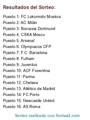 Lista de participantes: FC Porto, Arsenal, FC Lokomotiv Moskva, Newcastle United, F.C. Barcelona, AC Milán, ACF Fiorentina, Parma, Borussia Dortmund, AS Roma, Olympiacos CFP, Juventus, Atlético de Madrid, Chelsea, Fulham, CSKA Moscu.