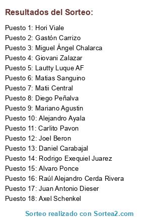 Lista de participantes: Diego Peñalva, Carlito Pavon, Lautty Luque AF, Raúl Alejandro Cerda Rivera, Mariano Agustin, Miguel Ángel Chalarca, Gastón Carrizo, Juan Antonio Dieser, Alvaro Ponce, Hori Viale, Alejandro Ayala, Matii Central, Matias Sanguino, Joel Beron, Axel Schenkel, Daniel Carabajal, Giovani Zalazar, Rodrigo Exequiel Juarez.