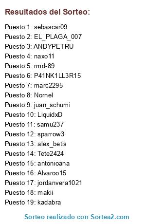Lista de participantes: sparrow3, samu237, EL_PLAGA_007, kadabra, P41NK1LL3R15, alex_betis, Nornel, juan_schumi, jordanvera1021, Alvaroo15, antonioana, sebascar09, LiquidxD, rmd-89, marc2295, Tete2424, makii, naxo11, ANDYPETRU.