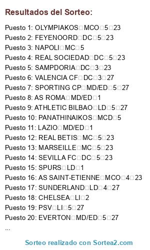 Lista de participantes: FIORENTINA DC 5 23, LAZIO MD/ED 1, SUNDERLAND LD 4 27, OLYMPIQUE LYON MD/ED 5 27, AS SAINT-ETIENNE MCO 4 23, REAL SOCIEDAD DC 5 23, ARSENAL MD/ED 5 27, VILLARREAL CF DC 5 23, JUVENTUS MC 1, AJAX MD/ED 5 27, MANCHESTER CITY MD/ED 5 27, BORUSSIA MG MC 5 23, MARSEILLE MC 5 23, VFB STUTTGART MC 5 23, WEST HAM DC 3 27, VALENCIA CF DC 3 27, EVERTON MD/ED 5 27, FEYENOORD DC 5 23, MANCHESTER UTD MC 5, MALAGA CF MC 5 23, NAPOLI MC 5, CHELSEA LI 2, SHAKHTAR DONETSK DC 5 23, LIVERPOOL MD/ED 5 27, PANATHINAIKOS MCD 5, SPURS LD 1, REAL BETIS MC 5 23, VFL WOLFSBURG MD/ED 5 27, SPORTING CP MD/ED 5 27, ANDERLECHT MD/ED 5 27, AS ROMA MD/ED 1, ATHLETIC BILBAO LD 5 27, OLYMPIAKOS MCO 5 23, INTER MC 1, SAMPDORIA DC 3 23, SEVILLA FC DC 5 23, PSV LI 5 27, AC MILAN DC 5 23.