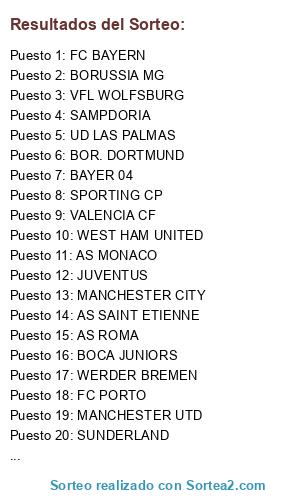 Lista de participantes: AC MILAN, AS MONACO, AS SAINT ETIENNE, BORUSSIA MG, PSV, FC BAYERN, AJAX, LIVERPOOL, MALAGA CF, SUNDERLAND, WEST HAM UNITED, VFB STUTTGART, MANCHESTER CITY, PSG, BOR. DORTMUND, INTER, VALENCIA CF, FC BARCELONA, LEVANTE UD, EVERTON, JUVENTUS, REAL MADRID CF, ATHLETIC BILBAO, BAYER 04, AS ROMA, PANATHINAIKOS, BOCA JUNIORS, VILLARREAL CF, VFL WOLFSBURG, UD LAS PALMAS, SPURS, ANDERLECHT, WERDER BREMEN, CELTA, SEVILLA FC, OLYMPIAKOS, MANCHESTER UTD, BORDEAUX, SAMPDORIA, FC PORTO, SPORTING CP.