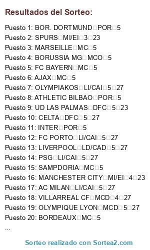 Lista de participantes: PSG LI/CAI 5 27, FC PORTO LI/CAI 5 27, MARSEILLE MC 5, OLYMPIAKOS LI/CAI 5 27, BORDEAUX MC 5, AC MILAN LI/CAI 5 27, LIVERPOOL LD/CAD 5 27, ATHLETIC BILBAO POR 5, BOR. DORTMUND POR 5, UD LAS PALMAS DFC 5 23, AJAX MC 5, BORUSSIA MG MCO 5, AS ROMA POR 5, SPURS MI/EI 3 23, FC BAYERN MC 5, SAMPDORIA MC 5, MANCHESTER CITY MI/EI 4 23, VILLARREAL CF MCD 4 27, REAL BETIS MCD 5 27, OLYMPIQUE LYON MCD 5 27, VFL WOLFSBURG MC 5, CELTA DFC 5 27, INTER POR 5.