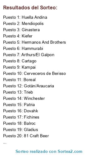 Lista de participantes: Fichines , Winchester , Bravos , Huella Andina , Gladius , Mendiopolis , Dackel , Hammurabi , Patria , Kiefer , Ginastera , Madre Tierra , Edelbrauer , Dovahk , 81 Craft Beer , Boreal , Monopoli , Ophelia , Kampai , Cartago , Trieb , Balroc , Cerveceros de Berisso , Gotán/Araucaria , San sebastian/Panacea , Arthurs/El Galpon , Hermanos And Brothers.
