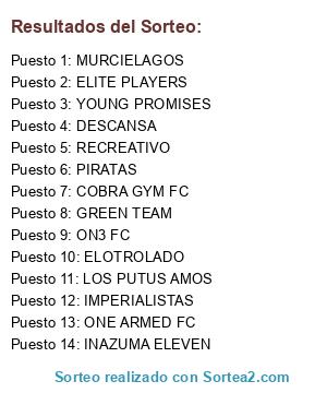 Lista de participantes: PIRATAS, ELOTROLADO, GREEN TEAM, ON3 FC, INAZUMA ELEVEN, IMPERIALISTAS, YOUNG PROMISES, RECREATIVO, ONE ARMED FC, COBRA GYM FC, LOS PUTUS AMOS, MURCIELAGOS, ELITE PLAYERS, DESCANSA.