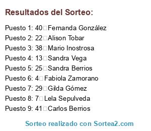 Lista de participantes: 1 Sandra Vega, 2 Sebastián Jara, 3 Lela Sepulveda, 4 Fabiola Zamorano, 5 Maria C Berrios A, 6 Sandra Berrios, 7 Lela Sepulveda, 8 Sandra Berrios, 9 Cristobal González Imbarack, 10 Fabiola Zamorano, 11 Josefa Ramírez Cardonne, 12 Maria C Berrios A, 13 Sandra Vega, 14 Bernardita Wielandt, 15 Fabiola Zamorano, 16 Gilda Gómez, 17 Cristobal González Imbarack, 18 Sandra Berrios, 19 Fernanda González, 20 Lela Sepulveda, 21 Anastacia Berrios, 22 Alison Tobar, 23 Sandra Berrios, 24 Silvia Arriola, 25 Sandra Berrios, 26 Lela Sepulveda, 27 Maria C Berrios A, 28 Maria C Berrios A, 29 Gilda Gómez, 30 Hugo Bertozzi, 31 Luis Avila, 32 Mario Hernandez, 33 Bernardita Wielandt, 34 Silvia Arriola, 35 Cristobal González Imbarack, 36 Hugo Bustamante, 37 Carlos Berrios, 38 Mario Inostrosa, 39 Mario Inostrosa, 40 Fernanda González, 41 Carlos Berrios, 42 Mario Hernandez, 43 Hugo Bustamante, 44 Alison Tobar, 45 Luis Avila, 46 Fernanda González, 47 Silvia Arriola, 48 Hugo Bertozzi, 49 Pedro Fuentes, 50 Lela Sepulveda.