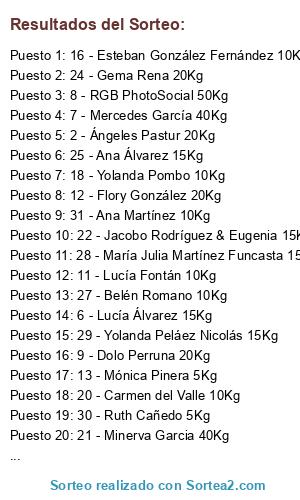 Lista de participantes: 1 - Rebeca Cancio Barela 20Kg, 2 - Ángeles Pastur 20Kg, 3 - María Goti Joyas 50Kg, 4 - Miguel Lucas 20Kg, 5 - Nereida Ramos 50Kg, 6 - Lucía Álvarez 15Kg, 7 - Mercedes García 40Kg, 8 - RGB PhotoSocial 50Kg, 9 - Dolo Perruna 20Kg, 10 - Eva Rocío Cubides 20Kg, 11 - Lucía Fontán 10Kg, 12 - Flory González 20Kg, 13 - Mónica Pinera 5Kg, 14 - María José Albuerne 20Kg, 15 - Carlos Trapiello Martínez 50Kg, 16 - Esteban González Fernández 10Kg, 17 - Rocío Álvarez 20Kg, 18 - Yolanda Pombo 10Kg, 19 - Rosa Ángeles García 20Kg, 20 - Carmen del Valle 10Kg, 21 - Minerva Garcia 40Kg, 22 - Jacobo Rodríguez & Eugenia 15Kg, 23 - Raquel Blanco 10Kg, 24 - Gema Rena 20Kg, 25 - Ana Álvarez 15Kg, 26 - Mónica Martínez 25Kg, 27 - Belén Romano 10Kg, 28 - María Julia Martínez Funcasta 15Kg, 29 - Yolanda Peláez Nicolás 15Kg, 30 - Ruth Cañedo 5Kg, 31 - Ana Martínez 10Kg.