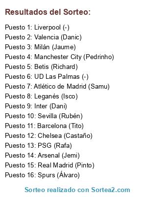 Lista de participantes: Manchester City (Pedrinho), Valencia (Danic), Inter (Dani), Chelsea (Castaño), Leganés (Isco), Liverpool (-), Spurs (Álvaro), PSG (Rafa), Barcelona (Tito), Real Madrid (Pinto), Atlético de Madrid (Samu), Betis (Richard), Milán (Jaume), Arsenal (Jemi), UD Las Palmas (-), Sevilla (Rubén).