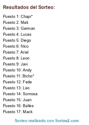 Lista de participantes: Andy, Ariel, Balles, Bicho*, Chapi*, Diego, Fede, German, Javi, Juan, Leo, Leon, Lucas, Mack, Mati, Nico, Somosa.