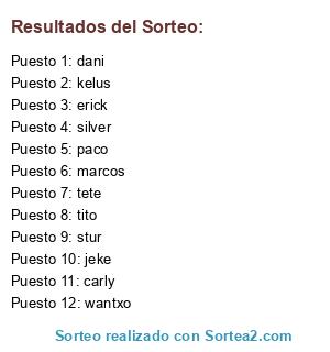 Lista de participantes: jeke, paco, carly, wantxo, stur, erick, silver, tete, marcos, kelus, dani, tito.