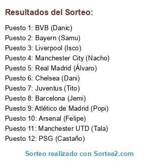 Lista de participantes: Bayern (Samu), Barcelona (Jemi), Chelsea (Dani), Arsenal (Felipe), PSG (Castaño), Juventus (Tito), Real Madrid (Álvaro), Liverpool (Isco), Manchester City (Nacho), Manchester UTD (Tala), BVB (Danic), Atlético de Madrid (Popi).
