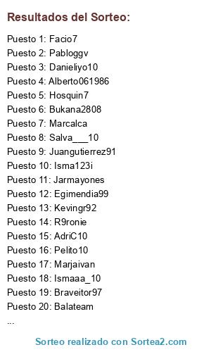 Lista de participantes: Juangutierrez91, Euskdeivid, Assasinstoto, Braveitor97, Ramalho55, Spain_kiko, Arovira9, R9ronie, Balateam, Adrimaister10, Jarmayones, Egimendia99, Isma123i, Pelito10, Pabloggv, Marcalca, Alberto061986, Jorgena87, Danieliyo10, Bukana2808, Hosquin7, Marjaivan, Pokov7, Ismaaa_10, Kevingr92, Facio7, AdriC10, Joshu2109, Gysan_CLS, Salva___10, Pelizelli, Alr1979.