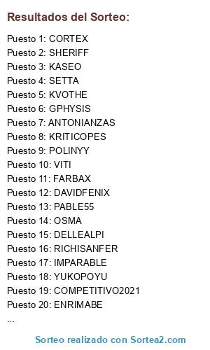 Lista de participantes: ALIOLI, KASEO, CORTEX, BEKOBIC, DIEGORIBA, AVELINO, IMPARABLE, ENRIMABE, DELLEALPI, FARBAX, GARCIALEGA, JOSELITO, KRITICOPES, KVOTHE, SETTA, MARTINNBOSS, CASES, PABLE55, GPHYSIS, POLINYY, OSMA, SHERIFF, YUKOPOYU, VITI, ALBO, DAVIDFENIX, ADRIXGN, BDELPRADO, COMPETITIVO2021, RICHISANFER, ANTONIANZAS, THEGABRYY7.