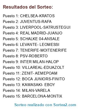 Lista de participantes: ZENIT- AEMEPOAM, LIVERPOOL-SATRUSTEGUI, KAWASAKI- EBOY, LEVANTE- LEOMESSI, MILAN-VARELA, REAL MADRID-JUANJO, TENERIFE-MOITENERIFE, JUVENTUS-RAFA, VILLAREAL-EDUAZOLT, BARCELONA-MONTIX, CHELSEA-KRATOS, PSV-ROBERTO, INTER MILAN-HALOP, BOCA JUNIORS-FINITO, SCHALKE 04-ANSALE.