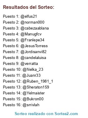 Lista de participantes: @norman000, @Yelmaister, @srrivlah, @Nelka_23, @JesusTorress, @cabezaablana, @Sheraton159, @Franlepe34, @verratta, @Jordisanvi82, @Juanr33, @elfus21, @Manugfcv, @candelaluisa, @Bukron00, @Ruben_1981_1.