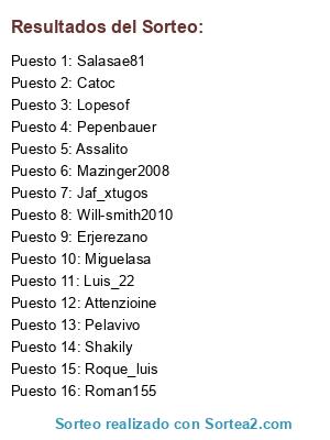 Lista de participantes: Roque_luis, Mazinger2008, Jaf_xtugos, Luis_22, Pepenbauer, Miguelasa, Erjerezano, Assalito, Shakily, Catoc, Salasae81, Roman155, Attenzioine, Lopesof, Will-smith2010, Pelavivo.