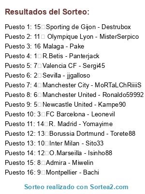 Lista de participantes: 1 R.Betis - Panterjack, 2 Sevilla - jjgalloso, 3 FC Barcelona - Leonevil, 4 Manchester City - MoRTaLChRiiiiS, 5 Newcastle United - Kampe90, 6 Manchester United - Ronaldo59992, 7 Valencia CF - Sergi45, 8 Admira - Miwelin, 9 Montpellier - Bachi, 10 Inter Milan - Sito33, 11 Olympique Lyon - MisterSerpico, 12 O.Marseilla - Isinho88, 13 Borussia Dortmund - Torete88, 14 R. Madrid - Yomayime, 15 Sporting de Gijon - Destrubox, 16 Malaga - Pake.