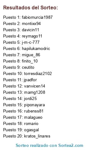 Lista de participantes: ogasgal, migue_86, kratos_linares, piponayara, j-m-c-777, malagueo, vanvicen14, davicin11, ceutito, finito_10, romario, rubenss81, fabiomurcia1987, jordi25, reymago11, montixx94, jpadfor, mamg1208, hapilukamodric, torresdiaz2102.