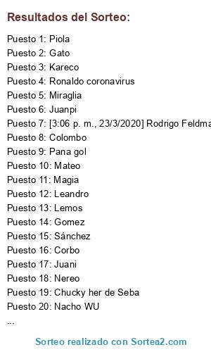 Lista de participantes: [3:06 p. m., 23/3/2020] Rodrigo Feldman Personal: Feldman, Sánchez, Piola, Ronaldo coronavirus, Gato, Nacho WU, Seba O, Lemos, Chucky her de Seba, Juanpi, Mateo, Miraglia, Pana gol, Colombo, Kareco, Leandro, Nereo, Juani, Magia, Corbo, Gomez.