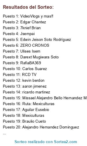 Lista de participantes: 7knief Brian, aaron jimenez, adolfo alvarez rodríguez, Aguilar Eusebio, ALBERT CAMPOS, Alejandro Fuentes, Alejandro Hernandez Dominguez, Aletz Saints Alfredo Rivera, alguien mas, AlxZeroX Chronicles, André Lopez, Andres Benavides, andres cristopher villalobos paloalto, animax200O, Armando Baralta, arturo arenas trinidad, Beers Nat, Braulio Cueto, Braulio cueto, Buker Enind, carlos antonio, Carlos Elí José Pascacio, Carlos Suarez, carlos walker uchiha, cesar i ure, Claundinskins Carreto, Daniel Estrada, Daniel Hurtado, Danielee Escobedo, Darext Mugiwara Soto, Dark Mane, Dark_nek94, Darkrai Friki, David Avilez, david k flores, David Tonatiuh Melgar Granados, Deivid V, Delta Force 619, DiLaurentis MX, Dio Von Hohenhaim, diofanto7descartes, Dj116. exe, Drain_11, Drusila nahema, Edgar Chantez, edgar hernandez, editson salinas sanchez, Edwin Jeison Soto Rodríguez, Edwin Rodriguez, EL Garyxx, Elias Sampson, Elmo Emo17 :v, Emlio Sanchez Mondragon, EmnulJw, FenixSenpai, Fernando García Lobato, Fernando Roque, Frank, FRANK SOTO, Gabino AvilaHace, Gabriel Cortés, GAME MONSTER, Gamer Zombie, Giack Boza YT, hidan414, Ian Ramírez, jaden yuki, JCmenful, Jedigal -THace, Jesus Salazar, Jesus Ungson, JIL OTAKU, Jose Gildardo Muñoz Mikery, Jose Jimenez, Jose Juan Alba Domínguez, Josue Jimenez, Jsempai, Juan Antonio Cervantes, Juan Jose Herrera, Karlos Lavoe, kevin berdon, Kevin david molina peral, kevin garrido (caca23choclo), kira stark Lalo Salaz Ya., Luis Díaz, Luis Moya, Luis Puma, mauri otazo, Mauri Pulgar :D, Mauricio Reyes, MEGAZU3D1, melchor batun ramirez, Mexiculturas, MF GV, Missael Alejandro Bello Hernandez Mizza', Monky729_, Mr. Loes, nekomande, Oliver Garcia, Oscar Eduardo Suarez Vega, OxtailDiamond24, Pablo Chay, papiro cortes, Pietro maximoff, PikabLuKuZaNagi, RafiaBA369, RAUL ROCKERSZERO, RCD TV, Rebelex00-Yu-Gi-Oh, VideoVlogs y mas!!, red eduard Trainer, RENDANG, ricardo franco cedillo, ricardo martinez, Ruta: Mexiculturas, Sakuya Izayoi, Sayaplus93, Spinel Skellington, tacho gaymer, Tanaka Aisaka, tesko hdez, TheLNaviz, Tsukiske, Ulises Isem, Wolf Productions, yudivafu 24, ZeonBell81, ZERO CRONOS, zintek Núñez.