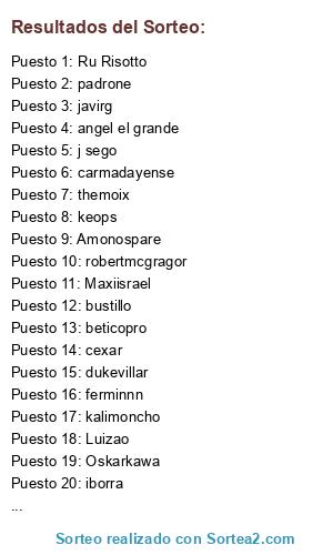 Lista de participantes: Oskarkawa, Luizao, ferminnn, eckae, padrone, sentenza, Miguelillodegra, robertmcgragor, kalimoncho, iborra, Ru Risotto, Proraiven, Sullendonkey, keops, Maxiisrael, Amonospare, ozora, angel el grande, j sego, mardom, osobla, javirg, rubencuervo, pepelu, cexar, lucamontana, beticopro, themoix, bustillo, mr rick, carmadayense, dukevillar.