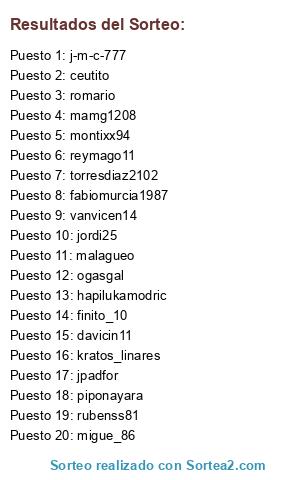 Lista de participantes: ogasgal, migue_86, kratos_linares, piponayara, j-m-c-777, malagueo, vanvicen14, davicin11, ceutito, finito_10, romario, rubenss81, fabiomurcia1987, jordi25, reymago11, montixx94, jpadfor, mamg1208, hapilukamodric, torresdiaz2102.