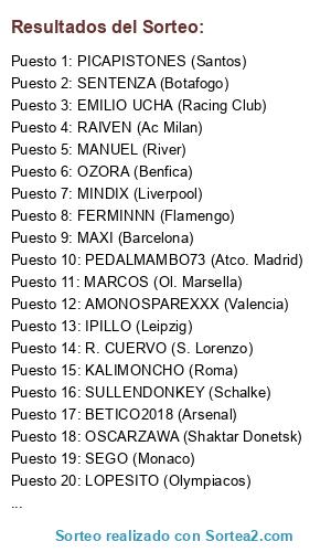 Lista de participantes: FERMINNN (Flamengo), RAIVEN (Ac Milan), EMILIO UCHA (Racing Club), R. CUERVO (S. Lorenzo), ECKAE (S. Ettiene), OSDOBLA (Ol. Lyon), MARCOS (Ol. Marsella), IPILLO (Leipzig), LUIZAO (Ajax), LOPESITO (Olympiacos), OZORA (Benfica), SENTENZA (Botafogo), AMONOSPAREXXX (Valencia), CAPELINHO (B. Dortmund), CEXAR1 (Psg), OSCARZAWA (Shaktar Donetsk), PADRONE (Zenit), IBORRA (Napoles), SULLENDONKEY (Schalke), MAXI (Barcelona), KALIMONCHO (Roma), MINDIX (Liverpool), MANUEL (River), SEGO (Monaco), BETICO2018 (Arsenal), PICAPISTONES (Santos), PEDALMAMBO73 (Atco. Madrid), LUCAMONTANA85 (Palmeiras), McGREGOR (Sparta de Rotterdam), PEPELU75 (Ado Den Haag), ABYRRULA (Boca Juniors), RU RISOTTO (Feyenoord).