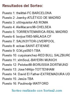 Lista de participantes: eckae-SAINT-ETIENNE, Pelotxo88-BORUSSIA DORTMUND, xXInquisitor-AS ROMA, Jose14Alijo-TOTTENHAM, xlmSouL-BAYERN MUNICH, thelittel-FC BARCELONA, Joenky-ATLÉTICO DE MADRID, SALIN3YTOR-LIVERPOOL, borjius1983-MÁLAGA CF, David El Father-EXTREMADURA UD, cuquisanchez-RED BULL SALZBURGO, Paulinodp-WATFORD, AleMacarro98-CHELSEA, TORRENTEMARICA-REAL MADRID, G3rLys0501-TBA, Jesús-TBA.