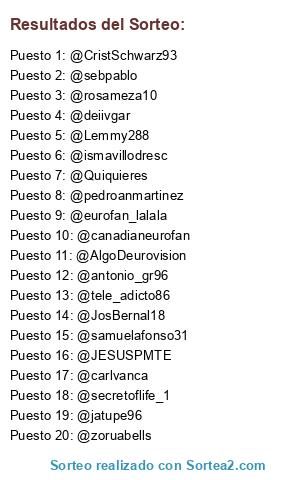 Lista de participantes: @JESUSPMTE, @secretoflife_1, @deiivgar, @ismavillodresc, @pedroanmartinez, @antonio_gr96, @Lemmy288, @zoruabells, @Quiquieres, @jatupe96, @eurofan_lalala, @CristSchwarz93, @tele_adicto86, @rosameza10, @sebpablo, @carlvanca, @AlgoDeurovision, @JosBernal18, @canadianeurofan, @samuelafonso31.