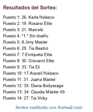 Lista de participantes: *1.* Sin dueño, 2. Rosario Reyes Sánchez, 3. Ana María Bodyssage, 4. Dehui Master, 5. Tania, 6.Andrea Rodríguez, 7.Enriqueta Elite, 8.Jimy Master, 9.Israel primo Fer, 10. Paula, 11. Ann Génesis, 12. Jocelin Velazquez, 13. Alejandro Master, 14. Ramiro Máster, 15. Claudia Elite, 16. Daniel RF, 17.Araceli Nolasco, 18. Claudia Badillo, 19. Rosario Elite, 20. Chuchin, 21. Marcelo, 22. Tia Eli, 23. María de la luz, 24. Ramon, 25. Karla Rodríguez, 26. Karla Nolasco, 27. Tia Vicky, 28. Israel Rodríguez, 29. Tia Beatriz, 30. Giovanni Elite, 31. Juana Master, 32. Francisco Elite, 33. Tia Eli, 34. Claudia Máster 49, 35. Diana Bodyssage.