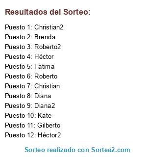 Lista de participantes: Fatima , Kate , Roberto , Diana , Christian , Gilberto , Brenda , Héctor , Christian2 , Diana2 , Gilberto2 , Hector2.