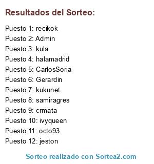 Lista de participantes: Gerardin, recikok, CarlosSoria, crmata, kula, kukunet, jeston, ivyqueen, halamadrid, samiragres , Admin, octo93.