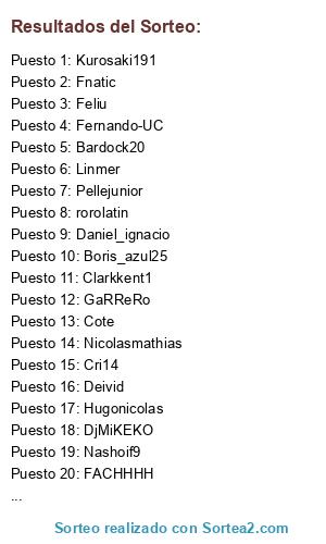 Lista de participantes: Feliu, DjMiKEKO, Lalitovilla, rorolatin, Eliasudec, Fnatic, FACHHHH, Niickoo, Turgon_04, SANTANA, Nashoif9, Toramatsu, Kurosaki191, Pellejunior, Boris_azul25, GaRReRo, NelsonLucybell, Cri14, Cote, Clarkkent1, Nicolasmathias, Linmer, Coqe, Deivid, Jona.fenomeno, Wriceth, Bardock20, Hugonicolas, Diegoweed, Fernando-UC, Sotimbrots, Daniel_ignacio.