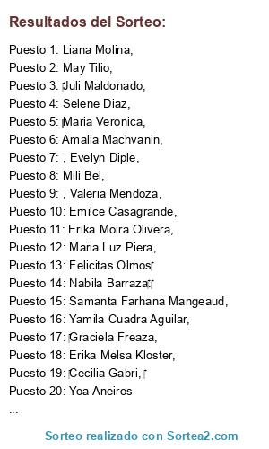 Lista de participantes: Maria Veronica, , Majo Portillo,, Ro Casanova, , , Evelyn Diple, , Belinda Pistacchia, , Yoa Aneiros, , Valeria Mendoza,, Juli Maldonado, , Yamila Cuadra Aguilar,, Liana Molina, , Erika Moira Olivera, , Graciela Freaza,, Emilce Casagrande, , Cecilia Gabri, , Maria Luz Piera, , Amalia Machvanin, , Lucia Tordente, , Mili Bel, , Mariel Alé,, , Rocio Sanchez, , Natalí D'Ottavio, , Marcia Zwenger, , May Tilio,, Selene Diaz, , Mayra Abregu,, Erika Melsa Kloster,, Samanta Farhana Mangeaud, , Samira Farhana, , Prii Gianelli,, Felicitas Olmos , Nabila Barraza., .