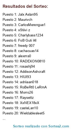 Lista de participantes: freedy 007, FaLlOo VaGxX, xStiivi z, Raysettz, cachacuas14, lBSPl DybaRooL, RoBeRt0 LeRmA, dabo1782, Nelson Avelar, casteLan10, XxNEX18xX, adriiaan018, FAL50, Maurivch, Betosr4, Garogool, JUANGUE991, RADEXON0810, CarlosMerengue1, Charlybass1234, CMW saiker, alexms0, AddisonAshcraft, Epik x AgEnT 47, Morro26, Andrés Rk, Jalx Aslan95, rosashj94, Wieldablesleet5, FoB Guti l4l, HIUI93, PaLafox92.
