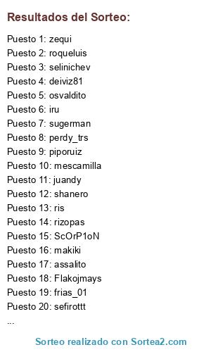 Lista de participantes: mescamilla, ZuLoViC, poletinho10, sefirottt, fortopeta, osvaldito, frias_01, cipotti, richisanfer, ScOrP1oN, erkobra, zequi, hybrid, sugerman, piporuiz, assalito, selinichev, ruben-94, Domin, iru, makiki, deiviz81, shanero, ris, luigicarras, juandy, fer_1980, roqueluis, Flakojmays, rizopas, jonnyciezano, perdy_trs.
