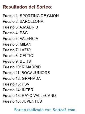 Lista de participantes: R.MADRID, VALENCIA, LAZIO, GRANADA, PSV, PSG, INTER, RAYO VALLECANO, BETIS, BOCA JUNIORS, CELTIC, A.MADRID, SPORTING DE GIJON, MILAN, JUVENTUS, BARCELONA.
