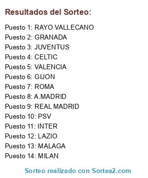 Lista de participantes: REAL MADRID, M.UNITED, VALENCIA, PSV, LAZIO, BETIS, MILAN, INTER, JUVENTUS, BARÇA, PSG, M.CITY, ROMA, CELTIC, BOCA JUNIORS, A.MADRID, RAYO VALLECANO, MALAGA, GIJON, GRANADA.