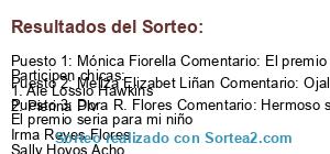 - Ganador 3: Dora R. Flores Comentario: Hermoso sorteo El premio seria para mi niño Irma Reyes Flores Sally Hoyos Acho Isaine AT Stefanny Magaly Flores