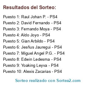 Lista de participantes: Marco Espinoza B. - PS4, Juan Ramon R.S - PS4, Diego Sandoval - PS4, Johan Andía T. - PS4, Fernando Moya - PS4, Yorman Olivares - PS4, Loan Olivera R. - PS4, Johan Acuña R. - PS4, Lorenzo Poma - PS4, Aldo Joyo - PS4, Carlos Espinosa - PS4, Jesñus Jauregui - PS4, Edwin Ledesma - PS4, Yoaking Leyva - PS4, Matthew Gonzales - PS4, Elvis Melvin P. - PS4, Hiroshi Onaga - PS4, Miguel Angel P.G. - PS4, Jonathan Moscol A. - PS4, Macgiver Puelles - PS4, Jimy Abregu - PS4, Raul Johan P. - PS4, Diego Chavarri B - PS4, Adrían Lozada - PS4, Angel JCV - PS4, Jhon Vargas G. - PS4, Anthony Aguilar - PS4, Omar Coronado V. - PS4, Alexis Zacarias - PS4, Jesus Alberto QE - PS4, Jhonatan Ruiz Z. - PS4, Carlos Bart TE - PS4, Jorge JT - PS4, Aron TC - PS4, Rodrigo Arista - PS4, David Fernando - PS4, Alvaro Macedo - PS4, Yoel Campos - PS4, Gian Arbildo - PS4, Marcelo SalRos - PS4, Kevo Miguel - PS4, Jair Rivera - PS4, Kalinsito Guadalupe - PS4, Richard Tarazona - PS4.