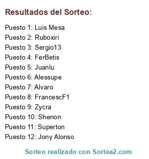 Lista de participantes: Shenon, FrancescF1, Zycra, Jony Alonso, FerBetis, Juanlu, Luis Mesa, Ruboxiri, Sergio13, Alvaro, Superton, Alessupe.
